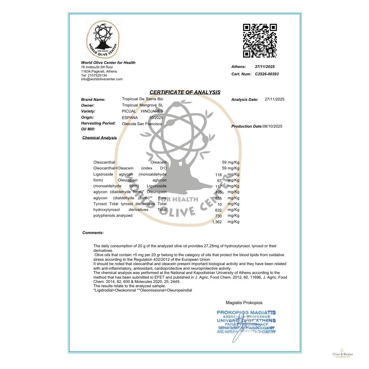 Harvested in October 2025, this estate olive oil delivers an impressive polyphenol level of 1362 mg/kg, making it a high-phenolic olive oil prized for its bold flavor and naturally occurring antioxidant compounds.